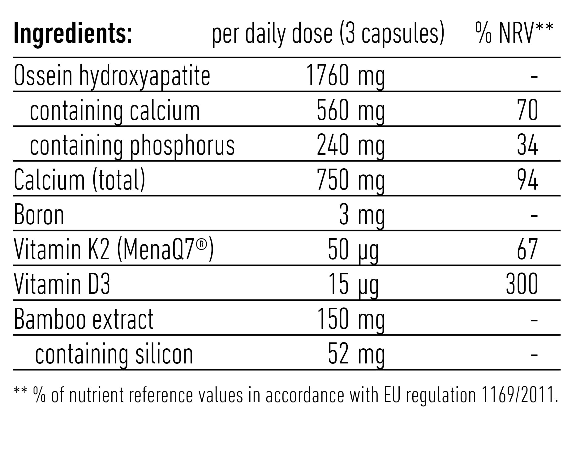 Ossein hydroxyapatite, coral calcium, hydroxypropyl methyl cellulose (capsule shell), bamboo shoot extract, menaquinone (vitamin K2)*, boric acid, cholecalciferol