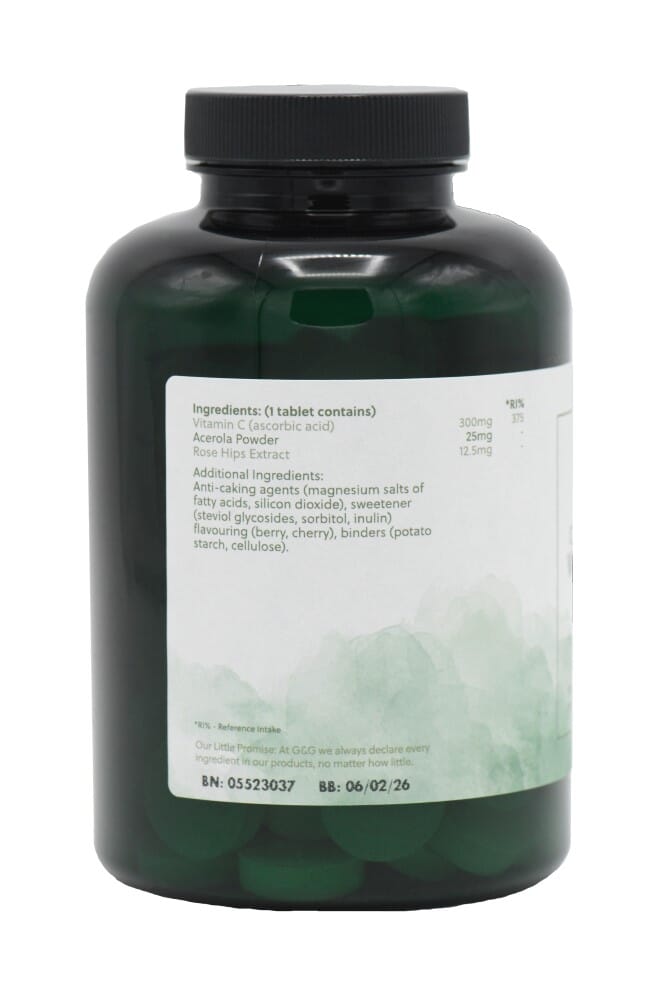 Vitamin C (ascorbic acid), Acerola powder, Rose hip extracts, Anti-caking agents (Magnesium salts of fatty acids, silicon dioxide), Sweetener (Steviol glycosides, Sorbitol, Inulin), Flavouring (berry, cherry), Binders (potato starch, cellulose)