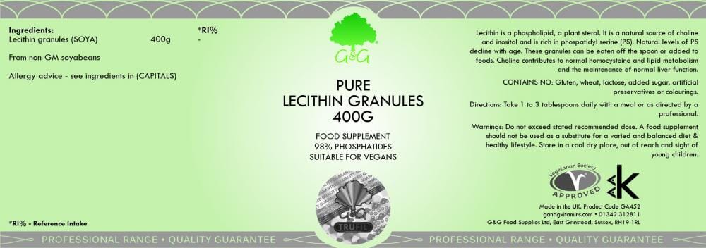 G&G's Lecithin Granules come from non-GM soya. Each tablespoon (7.5 grams) of lecithin granules contains about 1700mg phosphatidyl choline, 1000mg of phosphatidyl inositol, & about 2,200mg of essential fatty acids as linoleic acid. Also provides omega-3 linolenic acid. Vegetarian, vegan and kosher.