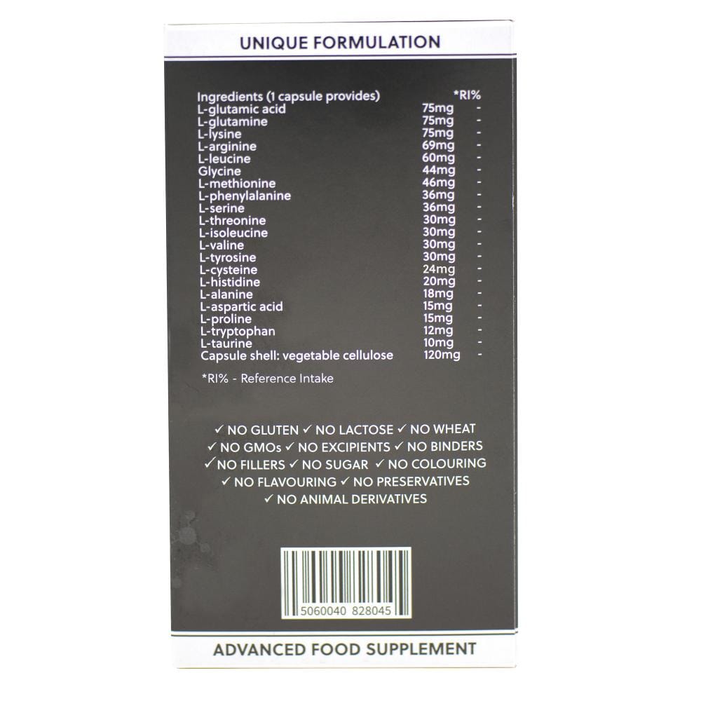 L-glutamic acid, L-lysine, L-glutamine, L-arginine, L-leucine, L-isoleucine, L-valine, Glycine, L-methionine, L-phenylalanine, L-serine, L-threonine, L-tyrosine, L-histidine, L-alanine, L-aspartic acid, L-proline, L-tryptophan, L-taurine, L-cysteine, Capsule shell: vegetable cellulose