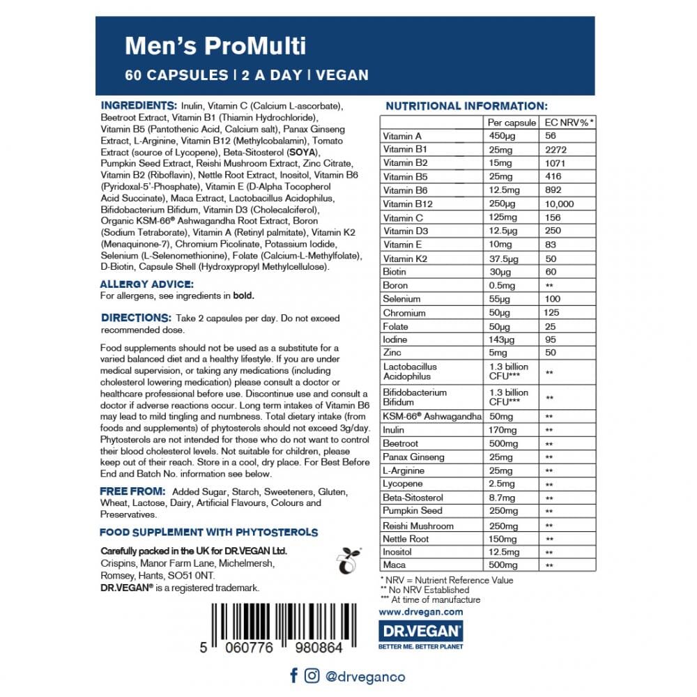 Inulin, Vitamin C (Calcium L-ascorbate), Beetroot Extract, Vitamin B1 (Thiamin Hydrochloride), Vitamin B5 (Pantothenic Acid, Calcium salt), Panax Ginseng Extract, L-Arginine, Vitamin B12 (Methylcobalamin), Tomato Extract (source of Lycopene), Beta-Sitosterol (contains Soya), Pumpkin Seed Extract (Cucurbita Pepo L.), Reishi Mushroom Extract, Zinc Citrate, Vitamin B2 (Riboflavin), Nettle Root Extract (Urtica dioica), Inositol, Vitamin B6 (Pyridoxal-5’-Phosphate), Vitamin E (D-Alpha Tocopherol Acid Succinate), Maca Extract (Lepidium meyenii), Lactobacillus Acidophilus, Bifidobacterium Bifidum, Vitamin D3 (Cholecalciferol), Organic KSM-66® Ashwagandha Root Extract, Boron (Sodium Tetraborate), Vitamin A (Retinyl palmitate), Vitamin K2 (Menaquinone-7), Chromium Picolinate, Potassium Iodide, Selenium (L-Selenomethionine), Folate (Calcium-L-Methylfolate), D-Biotin, Capsule Shell (Hydroxypropyl Methylcellulose).