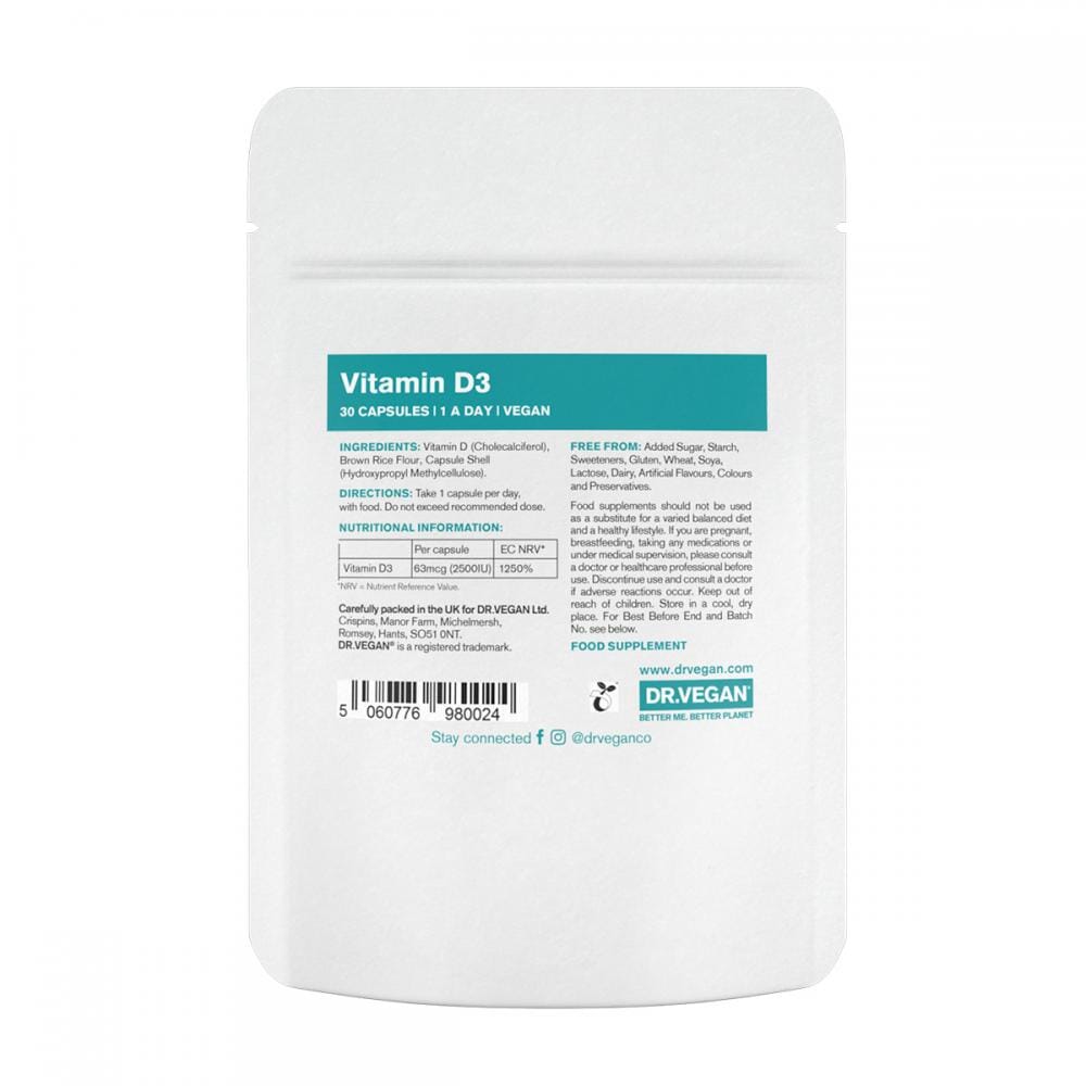 DR.VEGAN's plant-based Vitamin D3 (cholecalciferol from lichen) is absorbable, effective and free of any animal ingredients or nasty additives. Vitamin D is vital for a healthy immune system and for your body to absorb calcium to maintain healthy bones and teeth.