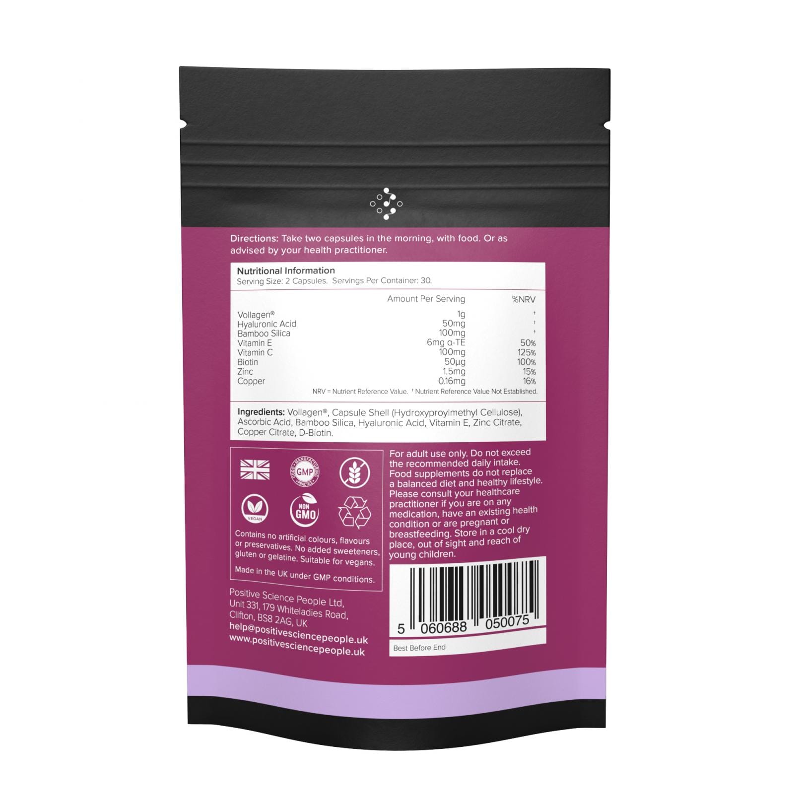 Vollagen®, Capsule Shell (Hydroxypropylmethyl Cellulose), Ascorbic Acid, Bamboo Silica, Hyaluronic Acid, Vitamin E, Zinc Citrate, Copper Citrate, D-Biotin