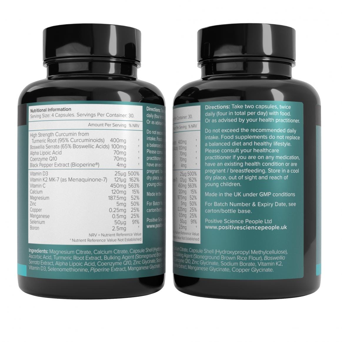 Magnesium Citrate, Calcium Citrate, Capsule Shell (Hydroxypropyl Methylcellulose), Ascorbic Acid, Turmeric Root Extract, Bulking Agent (Stoneground Brown Rice Flour), Boswellia Serrata Extract, Alpha Lipoic Acid, Coenzyme Q10, Zinc Glycinate, Sodium Borate, Vitamin K2, Vitamin D3, Selenomethionine, Piperine Extract, Manganese Glycinate, Copper Glycinate