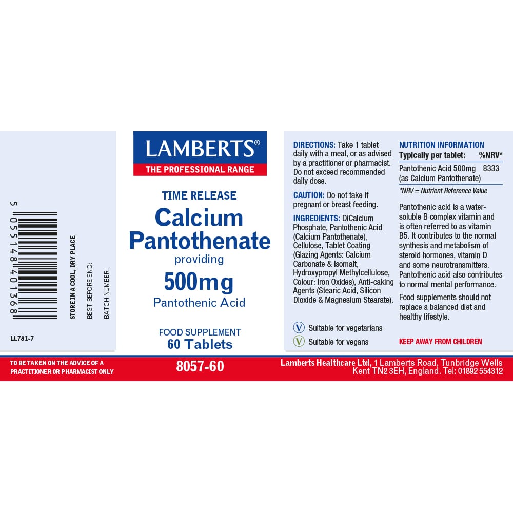This high strength pantothenic acid supplement is made in the UK to pharmaceutical standards. The tablets are formulated to be time release so that the vitamin is gradually released over a period of six to eight hours after swallowing.