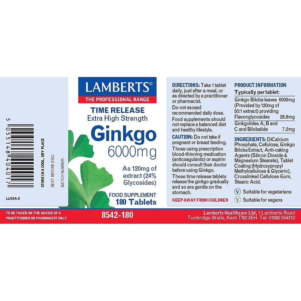 One of the highest strength ginkgo products available in the UK. Contains 120mg extract, equivalent to 6000mg of dried leaf. Time release tablets release ginkgo gradually and so are gentle on the stomach. Lamberts® use a standardised extract called GBE.