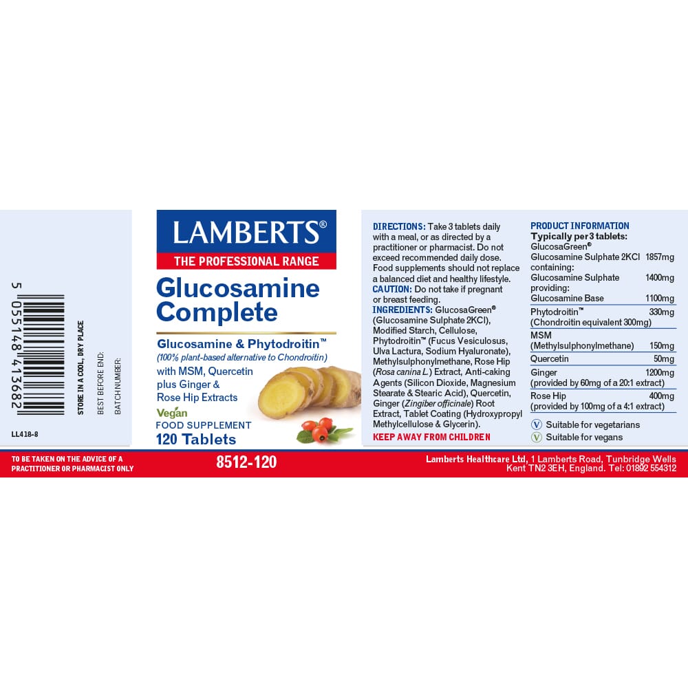 GlucosaGreen (Glucosamine Sulphate 2KCl) Modified Starch, Cellulose, Phytodroitin (Fucus Vesiculosus, Ulva Lactuca, Sodium Hyaluronate), Methylsulphonylmethane, Rose Hip (Rosa Canina L.) Extract, Anti-Caking Agents (Silicon Dioxide & Magnesium Stearate & Stearic Acid), Quercetin, Ginger (Zingiber officinale) Root Extract, Tablet Coating (Hydroxypropyl Methylcellulose & Glycerin)