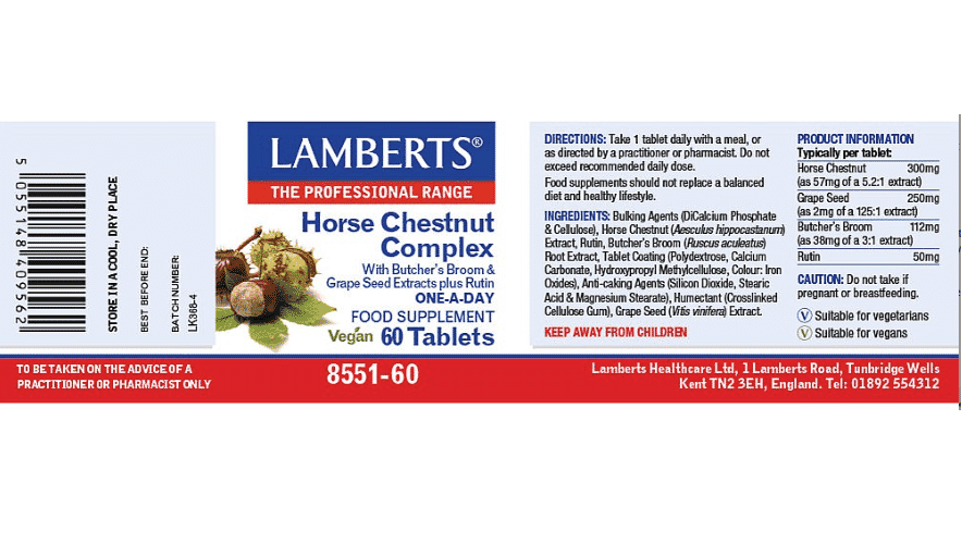 Lamberts® Horse Chestnut Complex is a unique formula that combines four herbs in just one tablet. Extracts of the seeds of European grapes contain one of the richest sources of anthocyanidins.