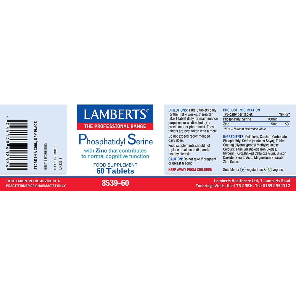 Lamberts® Phosphatidyl Serine 100mg uses the highest quality, pure phosphatidyl serine (PS) derived from soya. Zinc is also included in the formula. Recommended for adults of all ages striving to maintain normal cognitive function.