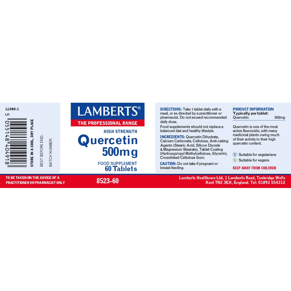 Extracted from a plant source. Provides a full 500mg of pure quercetin. Each 500mg tablet provides more quercetin than 1 kilo of apples. Potent natural antioxidant. Helps maintain cardiovascular health. Influence on the production and release of histamine.