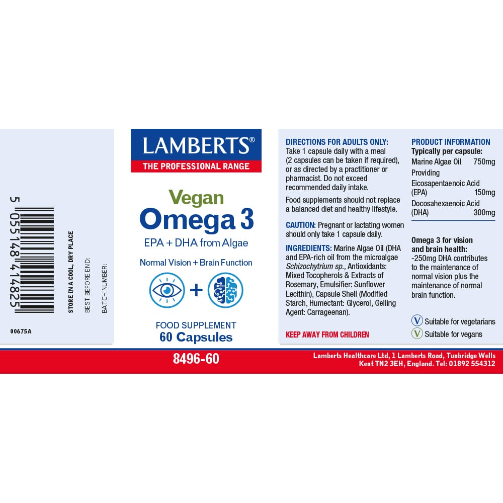 High potency Omega 3 oil with EPA 150mg & DHA 300mg. Derived from a unique algae grown in a controlled environment. Naturally free from contaminants. More sustainable. Entirely fish-free, the perfect supplement for vegans and vegetarians. Provides both EPA & DHA, the body ready forms of Omega 3 .