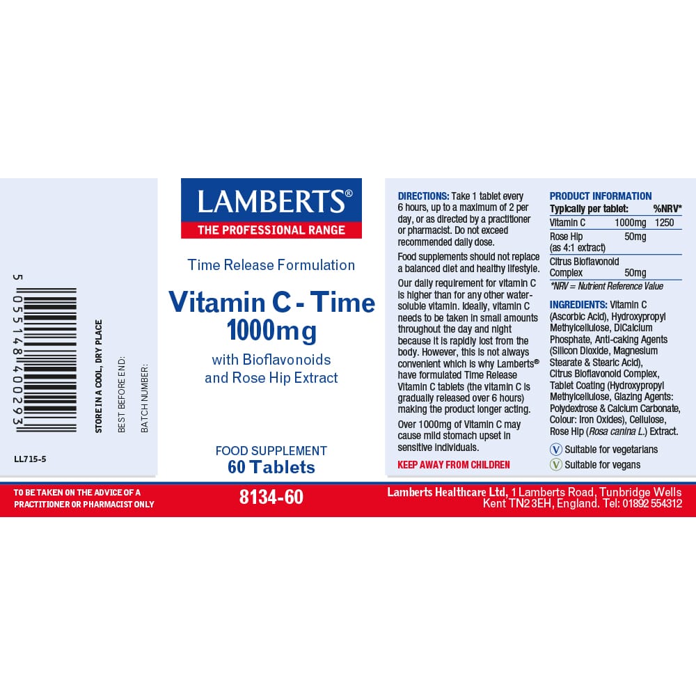 Vitamin C (as ascorbic acid), Hydroxypropyl Methylcellulose, DiCalcium Phosphate, Anti-caking Agents (Silicon Dioxide, Magnesium Stearate and Stearic Acid), Citrus Bioflavonoid Complex, Tablet Coating (Hydroxypropyl Methylcellulose, Glazing Agents: Polydextrose & Calcium Carbonate, Colour: Iron Oxides), Cellulose, Rose Hip (Rosa Canina L.) Extract