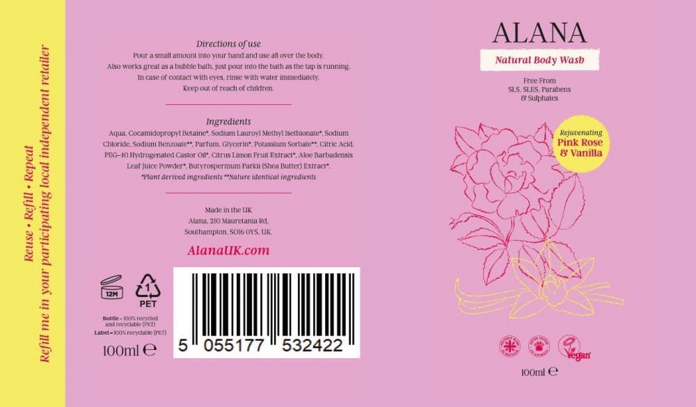 Alana is formulated with natural ingredients & free from SLS, SLES, parabens, sulphates & artificial colourants. These bottles are made with 100% recycled PET from waste collected on beaches & the surrounding environment. Alana never tests on animals & they are certified by the Vegan Society.