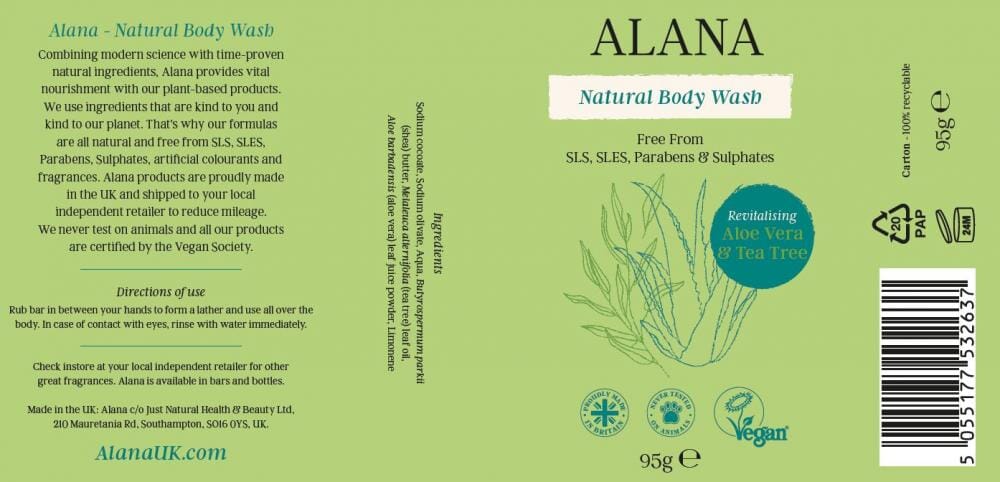 Alana is formulated with natural ingredients and free from SLS, SLES, parabens, sulphates, and artificial fragrances and colourants. The body wash, shampoo and conditioner bars are 100% plastic free, never tested on animals and they are all certified by the Vegan Society.