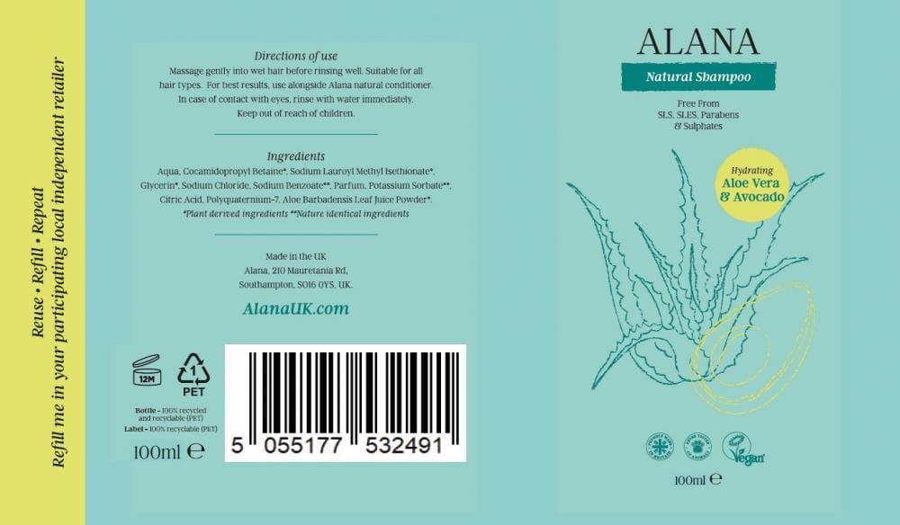 Alana is formulated with natural ingredients & free from SLS, SLES, parabens, sulphates & artificial colourants. These bottles are made with 100% recycled PET from waste collected on beaches & the surrounding environment. Alana never tests on animals & they are certified by the Vegan Society.