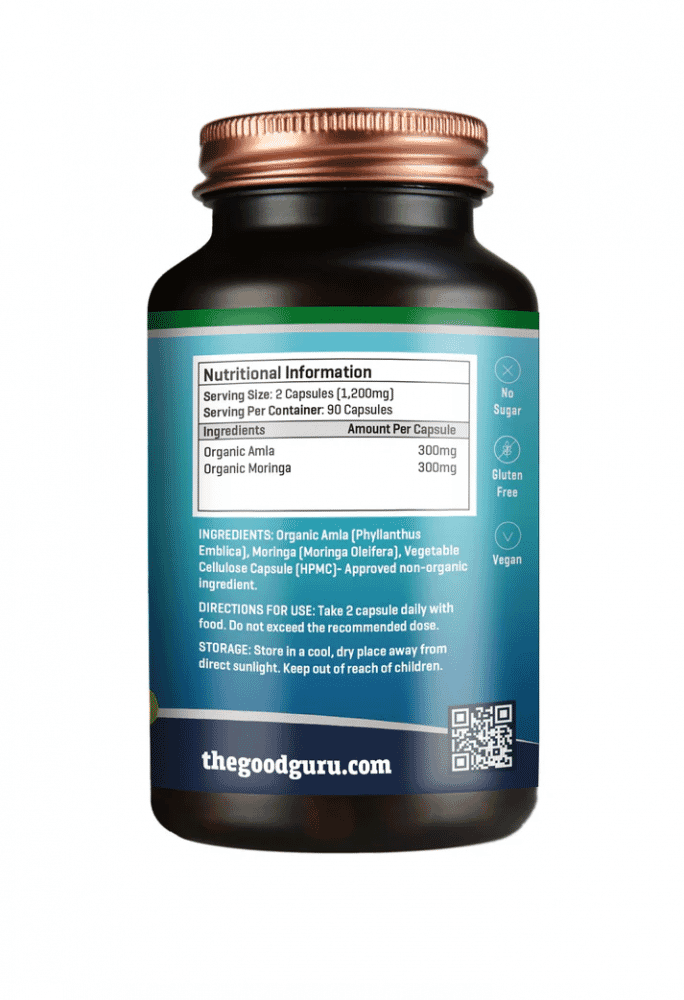 Organic Amla, Organic Moringa, Vegetable Cellulose Capsule (HPMC-approved non-organic ingredient)