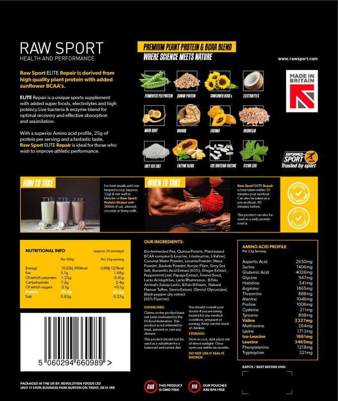 Raw Sport Elite Repair is best taken within 30 minutes post workout. Can also be taken as a pre-workout, 90 minutes before. This product can also be used as a daily protein source.