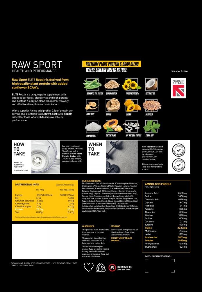 Raw Sport Elite Repair is best taken within 30 minutes post workout. Can also be taken as a pre-workout, 90 minutes before. This product can also be used as a daily protein source.