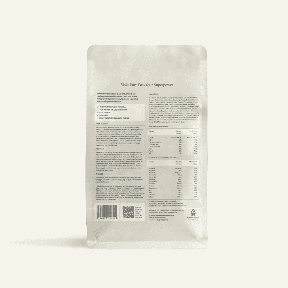 Peri-Boost is a vegan daily powder formulated to support body and mind during perimenopause. Includes Moldavian dragonhead, cacao, ginger and moringa; high in protein and fibre. It is a comprehensive blend of wholefoods, botanicals, and highly absorbable vitamins and minerals.