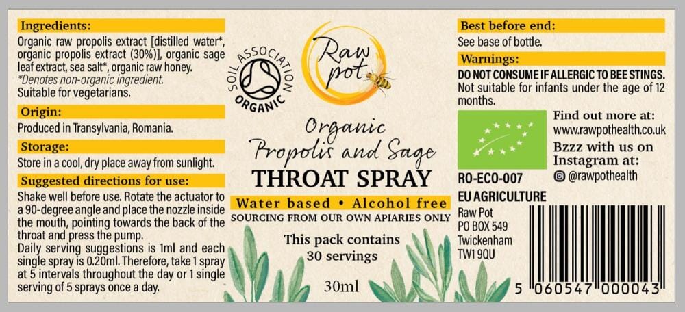 Organic raw propolis extract [distilled water*, organic raw propolis extract (30%)], organic sage leaf extract, sea salt*, organic raw honey