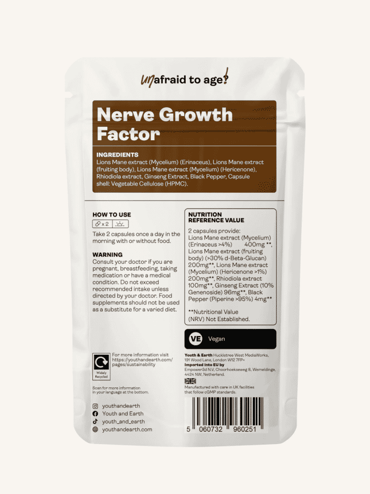Nerve Growth Factor is a high-strength dual extraction, full-spectrum Lion's Mane extract from the fruiting body of the mushroom. Aids focus and memory. Contains nerve growth factor promoting compounds.