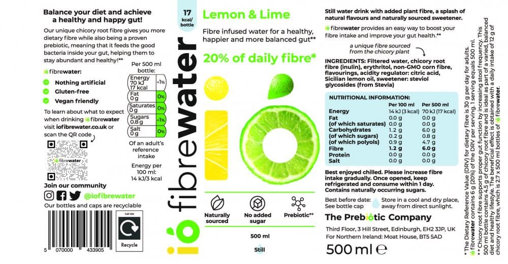 ió fibrewater is an award-winning naturally flavoured prebiotic water that's a first of its kind in the UK. Each bottle provides 100% of the daily recommended prebiotics intake and 20% of the recommended daily fibre intake - while still remaining totally clear in appearance like regular water.