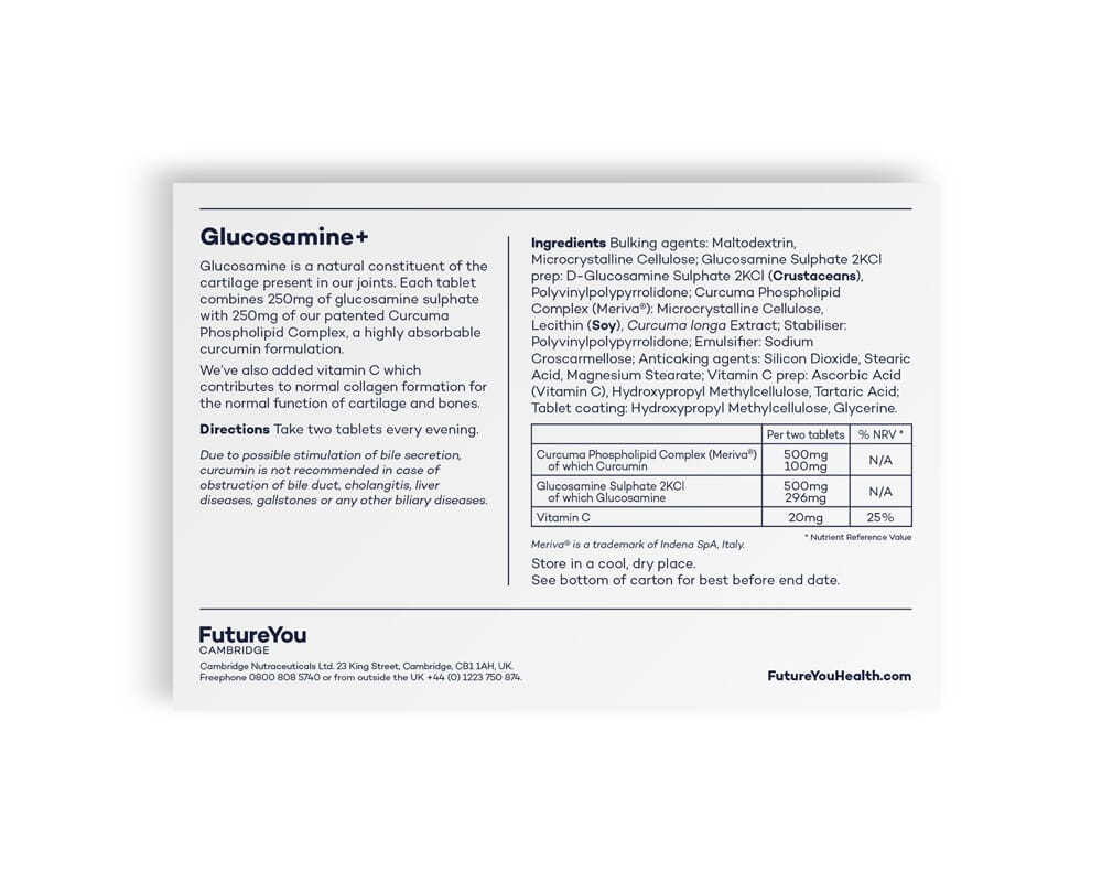 A premium heart and joint supplement with extra benefits. FutureYou's triple-action Glucosamine+ contains glucosamine and 500mg of their patented turmeric formulation, plus essential vitamin C for the maintenance of healthy joints and cardiovascular system.