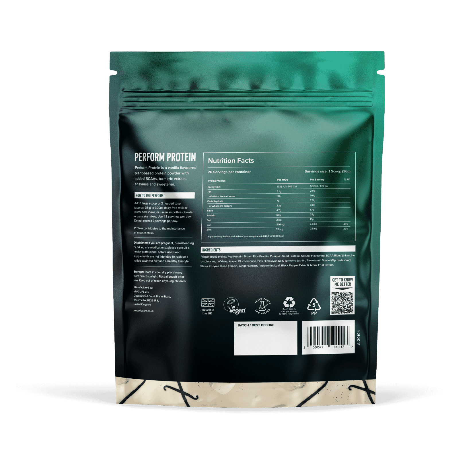 Clean, 25g of complete, easy-to-digest protein with BCAAs and tumeric. Using ancient digestion wisdom blended with modern amino science, Perform is a complete protein that’s easy for your body to use and tastes good. Naturally high in iron. No Fillers, Artificial Sweeteners, Flavours or Seed Oil.