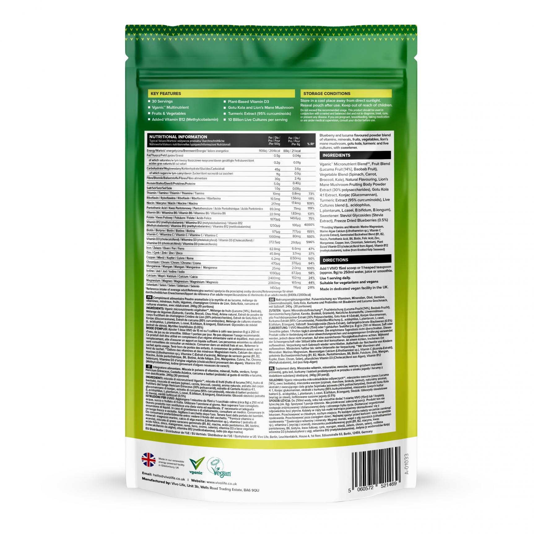 A 100% vegan blend of vitamins, minerals, live cultures, fruits and greens to support optimal health and immune function. Vitamin B12, plant-based vitamin D, gotu kola and lion’s mane mushroom, 10 billion live cultures, turmeric extract, iodine, calcium, selenium and magnesium.