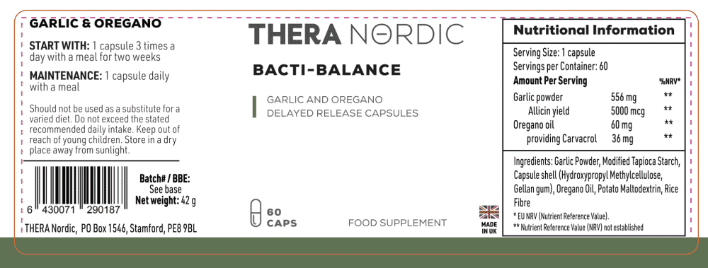 Bacti-Balance is a combination of garlic extract and oregano oil. Provides 5000mcg of allicin and 36mg of carvacrol. Targeted delivery to the small intestine via the specialised timed release capsule.
