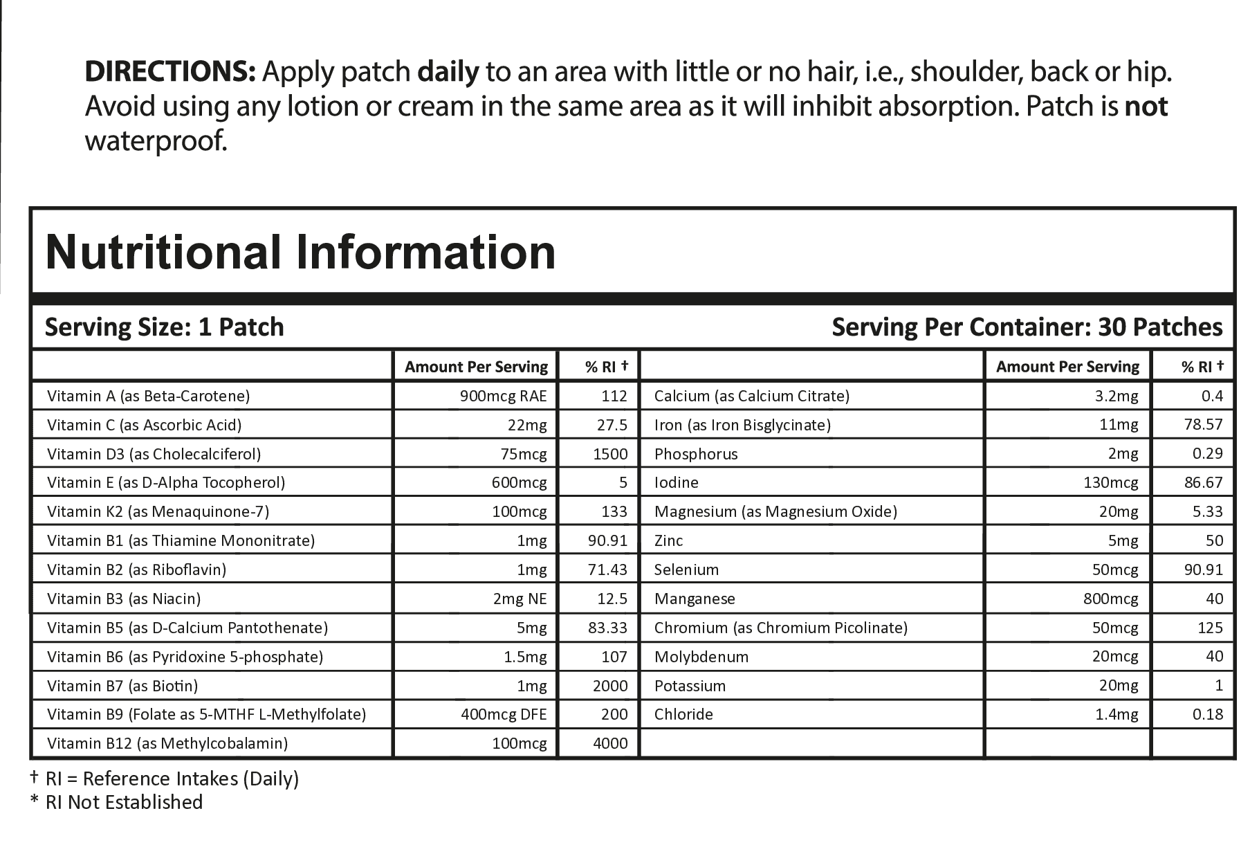 Vitamin A (as Beta-Carotene), Vitamin C (as Ascorbic Acid), Vitamin D (as Cholecalciferol), Vitamin E (as D-Alpha Tocopherol), Vitamin K2 (as Menaquinone-7), Vitamin B1 (as Thiamine Mononitrate), Vitamin B2 (as Riboflavin), Vitamin B3 (as Niacin), Vitamin B5 (as D-Calcium Pantothenate), Vitamin B6 (as Pyridoxine 5-phosphate), Vitamin B7 (as Biotin), Vitamin B9 (Folate as 5-MTHF L-Methylfolate), Vitamin B12 (as Methylcobalamin), Calcium (as Calcium Citrate), Iron (as Iron Bisglycinate), Phosphorus, Iodine, Magnesium (as Magnesium Oxide), Zinc, Selenium, Manganese, Chromium (as Chromium Picolinate), Molybdenum, Potassium, Chloride