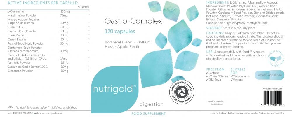L-Glutamine, Marshmallow Powder, Meadowsweet Powder, Psyllium Husk, Gentian Root Powder, Citrus Pectin, Green Papaya, Fennel Seed Herb Powder, Cardamom Seed Powder, Blend of Bifidobacteria lactis and bifidum, Turmeric Powder, Odourless Garlic Extract, Cinnamon Powder. Capsule Shell: Hydroxypropyl Methylcellulose.
