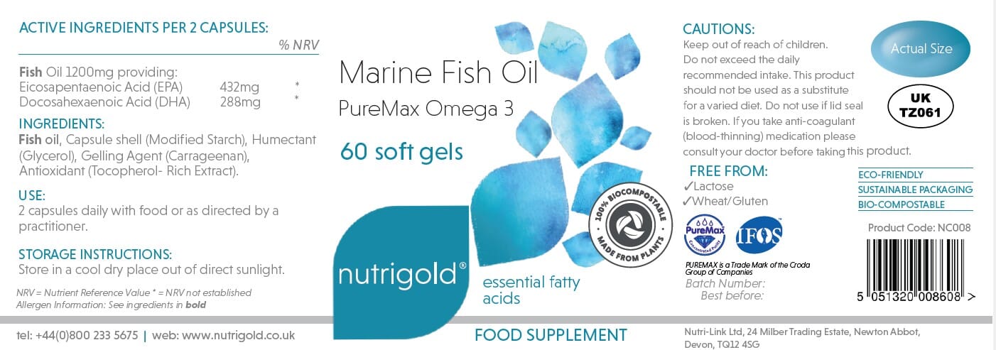 Marine Fish Oil omega 3 soft gel capsules containing 432mg EPA and 288mg DHA per serving.