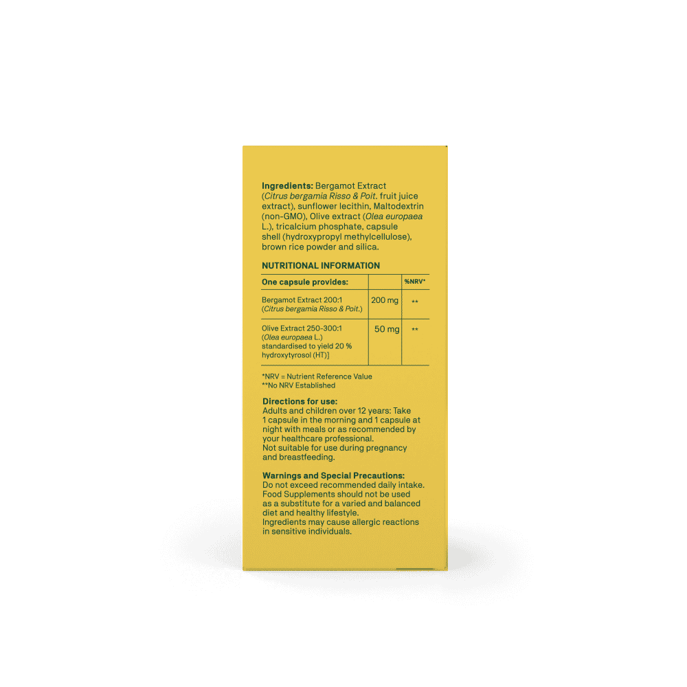 Bergamot extract (Citrus bergamia Risso & Poit. fruit juice extract), sunflower lecithin, maltodextrin (non-GMO), olive extract (Olea europaea L.), tricalcium phosphate, capsule shell (hydroxypropyl methylcellulose), brown rice powder, silica