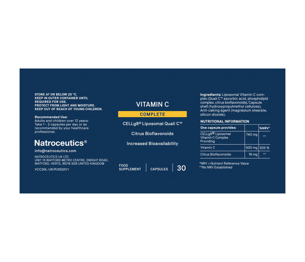 Natroceutics Vitamin C is a combination of the finest quality Vitamin C- Quali-C™ with citrus bioflavonoids. This combination is then enhanced with Cellg8™ liposomal delivery technology for superior and sustained bioavailability in the body.
