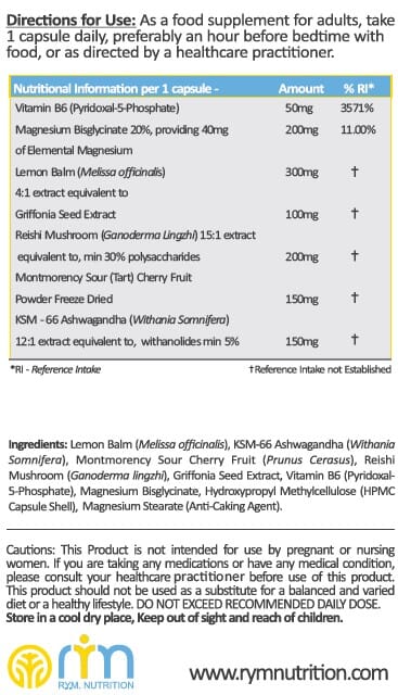 Lemon Balm (Melissa officinalis), KSM-66 Ashwagandha (Withania somnifera), Montmorency Cherry, Reishi Mushroom, 5-HTP (Griffonia simplicifolia), Vitamin B6 (Pyridoxal-5-Phosphate), Magnesium Bisglycinate, Organic Brown Rice Flour, Anti-Caking Agent (Magnesium Stearate), HPMC capsule shell (hydroxypropylmethylcellulose),