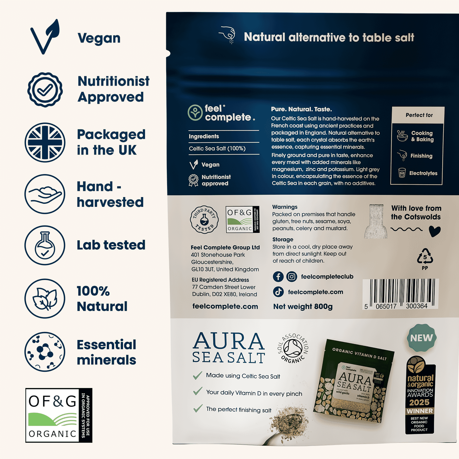 Certified Organic. 100% natural, 82 essential minerals. Less sodium than table salt, fine crystals - no need to grind. Perfect for cooking and baking. Hand-harvested on the French coast using ancient practices and packaged in the Cotswolds, Delicious depth of flavour.