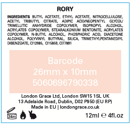 RORY: BUTYL ACETATE, ETHYL ACETATE, NITROCELLULOSE, ACETYL TRIBUTYL CITRATE, ADIPIC ACID/NEOPENTYL GLYCOL/TRIMELLITIC ANHYDRIDE COPOLYMER, ISOPROPYL ALCOHOL, STEARALKONIUM BENTONITE, ACRYLATES COPOLYMER, N-BUTYL ALCOHOL, PHOSPHORIC ACID, DIACETONE ALCOHOL, POLYVINYL BUTYRAL, SILICA, TRIMETHYLPENTANEDIYL DIBENZOATE, RED 36 (CI 12085), RED 7 LAKE (CI 15850), RED 6 LAKE (CI15850), TITANIUM DIOXIDE (CI 77891)