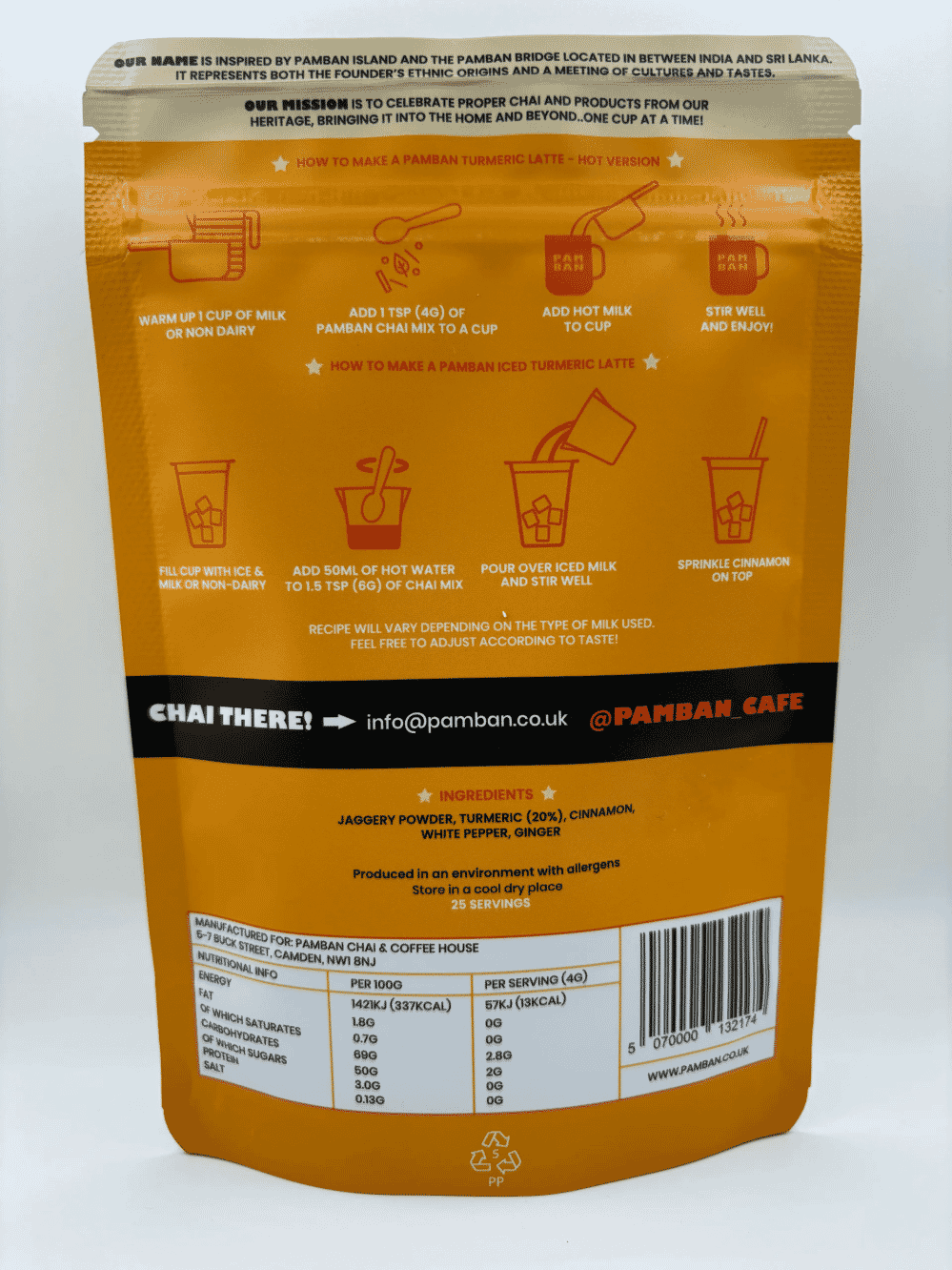 Turmeric Latte, meticulously crafted in the UK to deliver an award-winning fusion of flavour and wellness. This delightful blend offers the perfect balance of turmeric's golden warmth and aromatic spices. Simply stir and enjoy, as there's no need for syrups or concentrates.