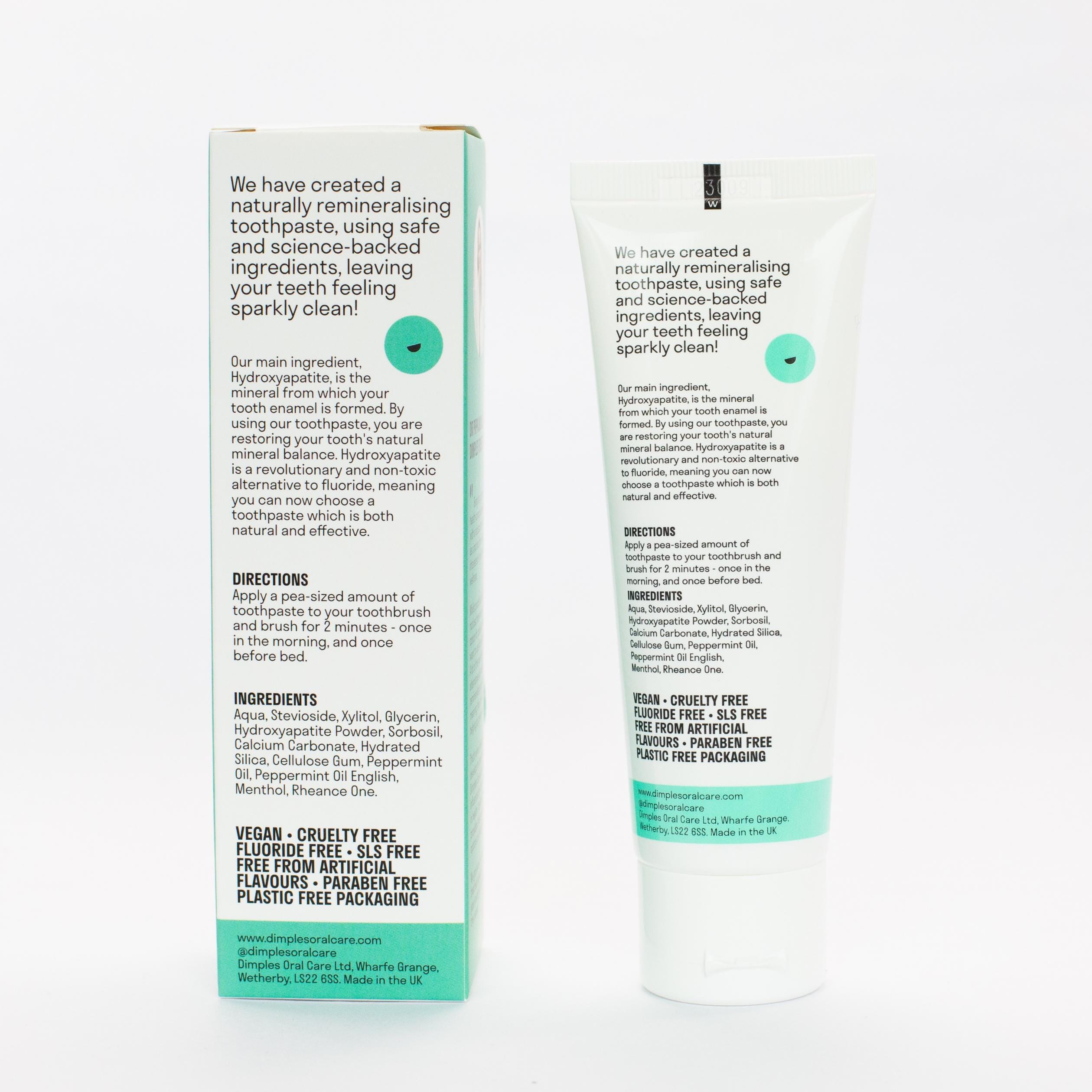 Dimples fluoride free and dentist designed toothpaste is naturally remineralising, leaving your teeth feeling sparkly clean.