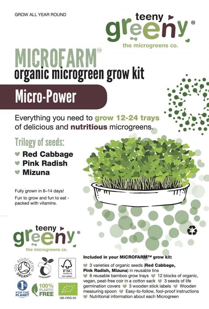 Teeny Greeny's Microfarm Grow kits are designed so you grow 3 trays of microgreens each week on a rotation. Microgreens can contain 40X nutrients of the mature plants so are eaten for this reason. They will re-grow so you will get more than the 12 -24 trays and are replenishable.