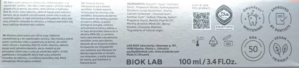 This exclusive whitening toothpaste, with minty grapefruit + Omyadent®, has been formulated to be extra gentle, yet super effective. RDA 50 - low abrasive and perfect for those with sensitive teeth or porcelain veneers. Strengthens teeth & gums, protects enamel and actively battles plaque formation.