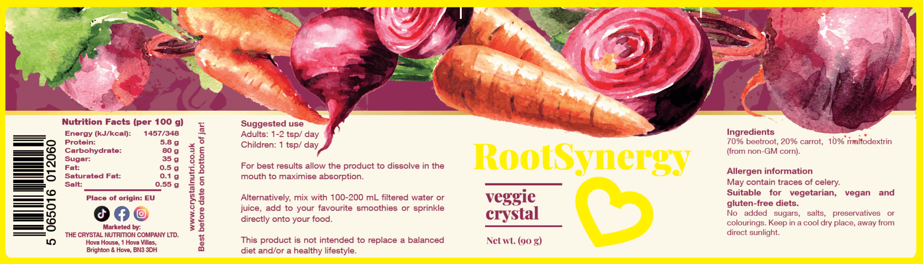 RootSynergy is a concentrated vegetable crystal blend of beetroot and carrot. A natural source of iron and folate from the whole plant. A great addition to a vegetarian or vegan lifestyle. Pioneering crystalline form to maximise absorption. Intense natural flavours.