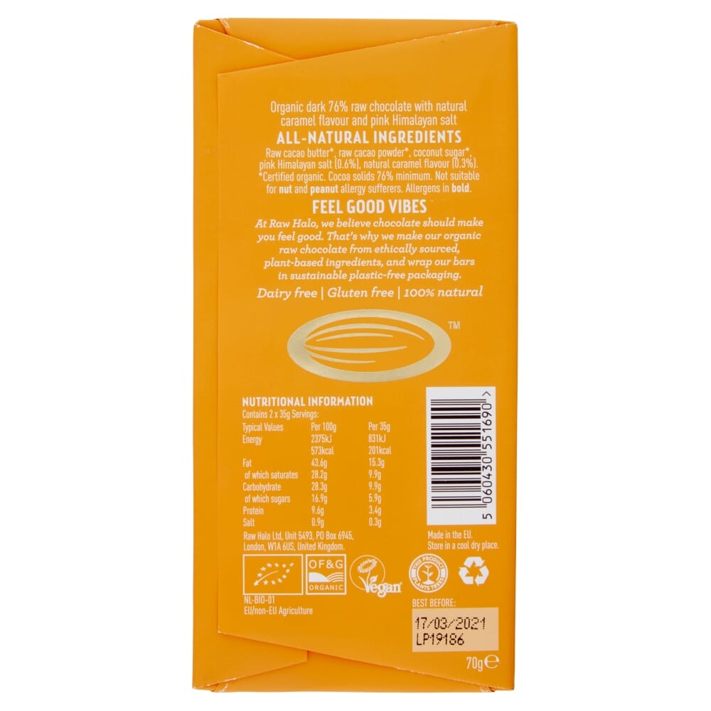 Dark 76% vegan chocolate made with organic cacao, and a touch of coconut sugar. Infused with natural caramel flavour and pink Himalayan salt.