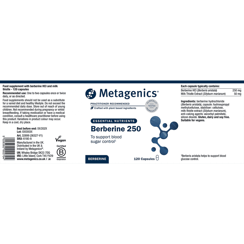 Berberine 250 offers targeted support for glucose and lipid metabolism, insulin sensitivity, gut health and microbial balance. With milk thistle to enhance bioavailability, this synergistic formula supports healthy HbA1c, cholesterol, and blood glucose regulation following carbohydrate-rich meals.
