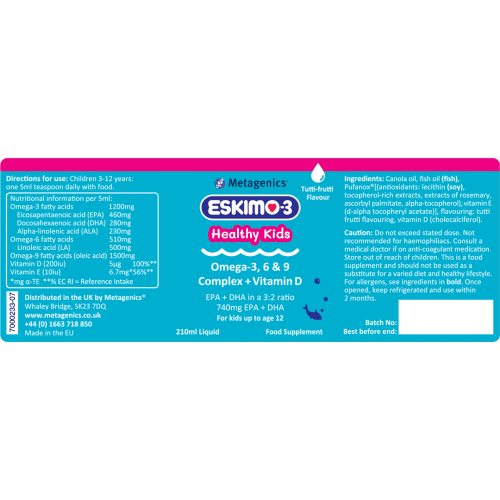 A pure, natural, essential fatty acid supplement formulated specifically to support optimal health in children aged 3 to 12. A child's brain and nervous system have different fatty acid requirements whilst growing, Eskimo®-3 Healthy Kids has been formulated to provide a balance of omega-3, 6 and 9.