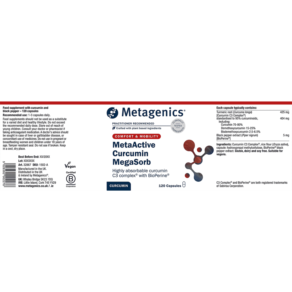 A highly bioavailable curcumin formula, providing curcumin as C3 Complex®, a patented blend of curcuminoids. MetaActive Curcumin MegaSorb also features BioPerine®, a black pepper extract, studied for its ability to enhance the bioavailability of nutritional compounds.