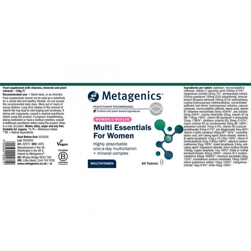 Multi Essentials For Women is a premium multivitamin and mineral formula for female health - providing extra iodine and selenium for thyroid and antioxidant support; boron for bone health; and broccoli and pomegranate extracts for hormone health, antioxidants and skin health.