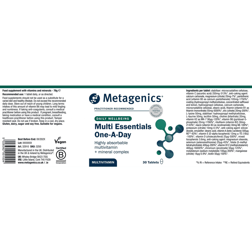 Stabiliser: microcrystalline cellulose, ascorbic acid, anti-caking agent: calcium carbonate, magnesium citrate, calcium pantothenate, coating (hydroxypropyl methylcellulose, hydroxypropyl cellulose, natural safflower and lemon, calcium carbonate, microcrystalline cellulose, stearic acid), menaquinone-7, thiamine mononitrate, zinc citrate, l-lysine, stabiliser: hydroxypropyl methylcellulose, l-taurine, lecithin, choline bitartrate, pyridoxal-5-phosphate, riboflavin, nicotinamide, potassium citrate, emulsifier: stearic acid, anti-caking agent: silicon dioxide, beta-carotene, d-alpha tocopherol, cholecalciferol, mixed tocopherols, anti-caking agent: magnesium stearate, selenomethionine, 5-methyl tetrahydrofolate, methylcobalamin, chromium picolinate, sodium molybdate, manganese citrate, biotin