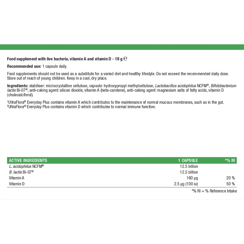 UltraFlora® Everyday Plus is ideal for supporting microflora balance, mucous membranes and immune function. With the added benefits of vitamin D3 and vitamin A, it's a high potency formula, with each capsule delivering 25 billion live bacteria, designed for complete digestive and immune support.